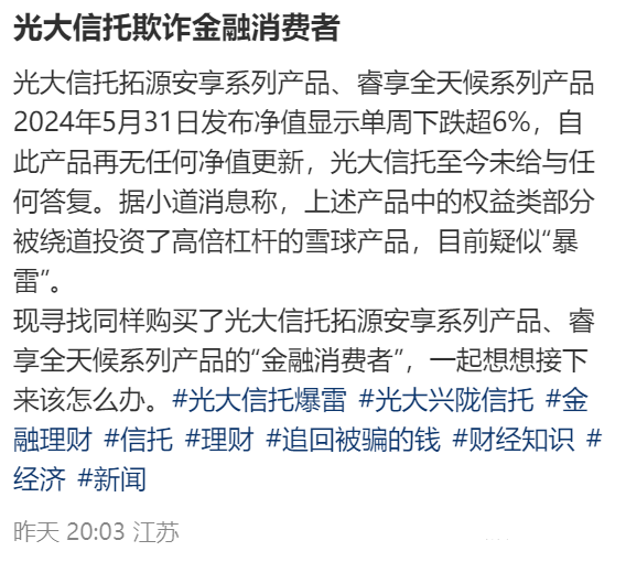 根据该网友爆料,5月31日净值显示产品单周下跌6%,自此再无净值更新。据小道消息,光大信托这两款产品的权益类部分被绕道投资了高杠杆的雪球产品,目前疑似暴雷。