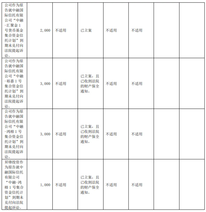 2、公司作为原告就中融国际信托有限公司“中融裕嘉1号集合资金信托计划”到期未兑付向法院提起诉讼。目前已立案,且收到法院的财产保全通知。