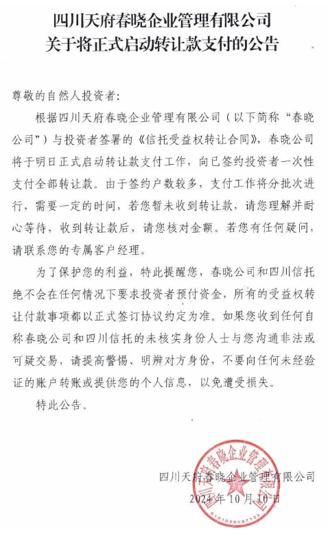 2024年10月10日,四川信托的自然人投资者收到通知——明天开始发钱!