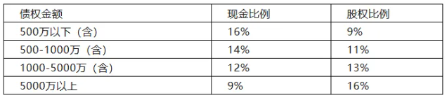 现金+股权的合计比例是25%,根据债权金额大小,现金和股权的配比不同: