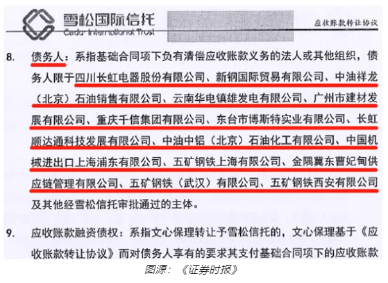 据《证券时报》获得的雪松信托与文心保理之间的《应收账款转让协议》(42份协议清一色为格式化协议)显示,债务人包括四川长虹电器股份有限公司、中油祥龙(北京)石油销售有限公司、五矿钢铁上海有限公司等14家付款人。都是相当具有实力的债务人。