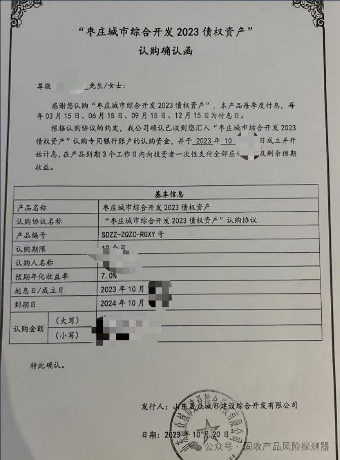 Securities industry据固收风险探测器消息,定融产品:枣庄城市综合开发2023债权资产期限1年期,已经与2024年10月到期,并且出现本金逾期。