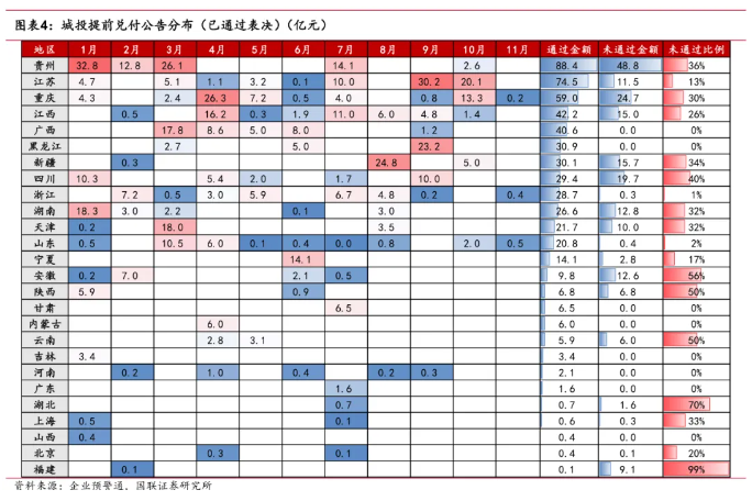 同时,贵州、重庆的未通过规模和比例均较高,市场分析这可能是由于这些地区的城投债多以面值为兑付价格,增大了投资人的受损概率,以及拟兑付债券本身票面利率较高,投资人不愿意放弃票息收益。