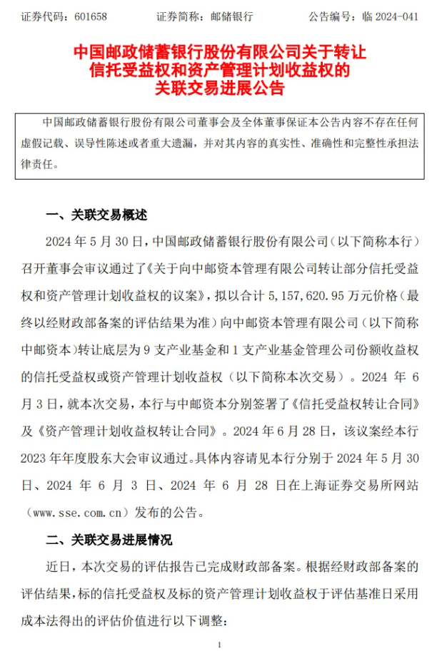 11月11日,邮储银行公告,公司拟以合计515.76亿元价格(最终以经财政部备案的评估结果为准)向中邮资本管理有限公司转让底层为9支产业基金和1支产业基金管理公司份额收益权的信托受益权或资产管理计划收益权。