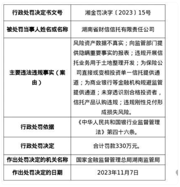 针对上述违法违规行为,金融监管总局湖南监管局根据《中华人民共和国银行业监督管理法》第四十六条及相关审慎经营规则,对财信信托合计罚款330万元。