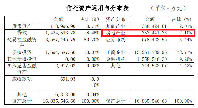 据西藏信托2023年报披露,公司自营资产投向房地产的资金为零,而主要投到了金融机构、实业、证券市场等,而信托资产投资1683.5亿元,其中投向房地产35.34亿元,占比2.1%。