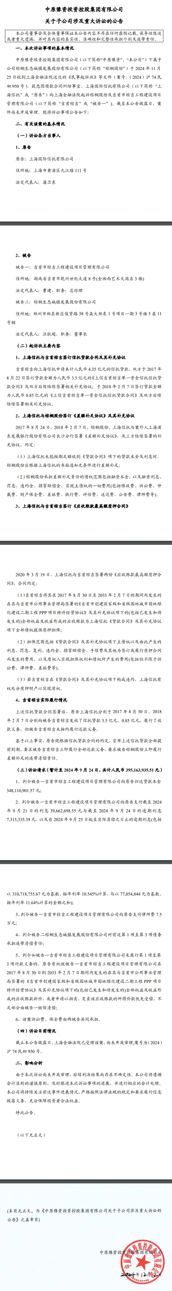 Trust financing2024年12月2日,中原豫资投资控股集团有限公司(以下简称“中原豫资”、“本公司”)下属子公司棕榈生态城镇发展股份有限公司(以下简称“棕榈股份”)于2024年11月25日收到上海金融法院送达的《民事起诉状》等文件(案号:(2024)沪74民初950号),获悉因借款合同纠纷事宜,上海国际信托有限公司(以下简称“上海信托”或“原告”)向上海金融法院起诉棕榈股份及吉首市棕吉工程建设项目管理有限公司(以下简称“吉首棕吉”或“被告一”)。