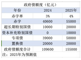 在新的定调下,市场普遍预计明年财政“组合拳”规模将比今年大幅增加,预计政府债务额度增加5万亿左右。其中赤字率将提升至4%左右,相比今年增长1个百分点,对应赤字规模约5.5万亿左右,相比今年增加1.5万亿左右;专项债规模预计5万亿左右,相比今年增长约1万亿;特别国债预计3万亿左右,其中2万亿属于超长期特别国债,1万亿用于注资六大行。实际相关数据仍有待明年3月全国“两会”期间揭晓。