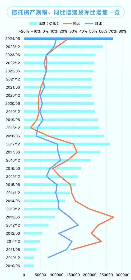 2024年,是见证信托资产规模创历史新高的年份。中国信托业整体规模曾在2017年底突破26万亿元,达26.25万亿元;2018年之后则陷入负增长,直至2022年二季度企稳回升,至2024年6月末已连续9个季度实现同比正增长。