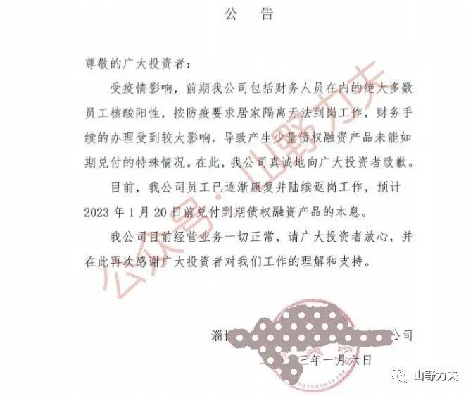 早在2023年1月初,当地曾出过展期公告,后也听闻部分投资者反馈,小额在陆续兑付;随着后续定融不断到期,负面舆情冲击,流动性不断恶化,逾期潮再次扑面而来。
