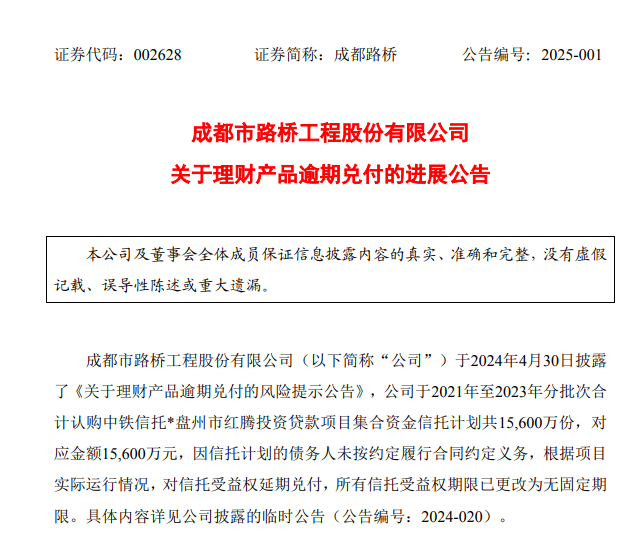 早在2024年4月30日,成都路桥发布关于理财产品逾期兑付的风险提示公告称,该公司于近日收到中铁信托出具的《告知函》,因信托计划的债务人未按约定履行合同约定义务,现根据项目实际运行情况,对信托受益权延期兑付,所有信托受益权期限已更改为无固定期限。