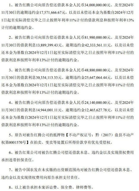 公告显示,诉讼涉及被告贵州省盘州市红腾开发投资有限公司(简称“红腾公司”)、贵州省红果经济开发区开发有限责任公司(简称“红果公司”)、中国农发重点建设基金有限公司(简称“中国农发”)。
