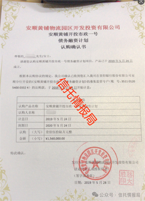 据公众号信托情报局消息,最近有投资人反馈称其购买的贵州安顺定融产品逾期近6年0回款。认购确认书信息显示,该项目为安顺黄铺开投市政一号债务融资计划,融资方安顺黄铺物流园区开发投资集团有限公司(现更名为安顺黄铺开发投资集团有限公司),注册资本21.8亿,市属国企,实际控制人为安顺市国有资产管理局。