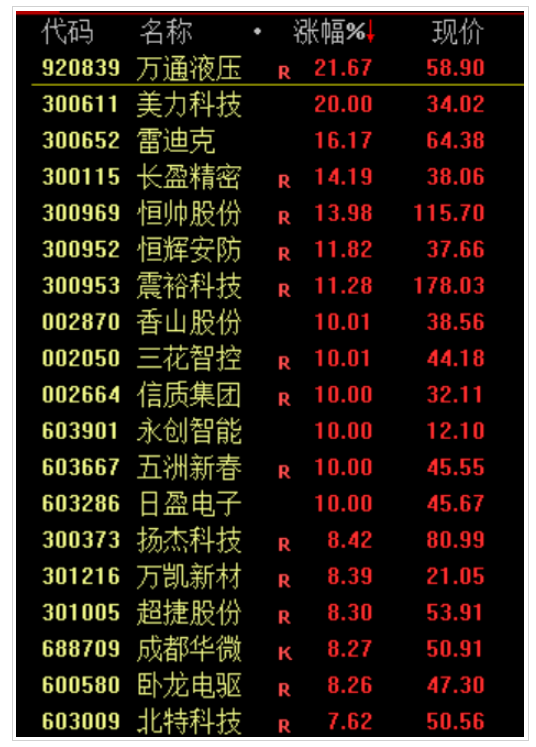 行业板块呈现普涨态势,汽车整车、航空机场、电网设备、化学制药、汽车零部件、电机、生物制品、医疗服务、电源设备板块涨幅居前,仅航运港口、小金属板块逆市下跌。个股方面,上涨股票数量超过4300只,逾80只股票涨停。机场航运板块震荡拉升,华夏航空涨停。数据中心电源概念表现活跃,四方股份、京泉华4天2板。 机器人概念股午后爆发,五洲新春、三花智控等十余股涨停。