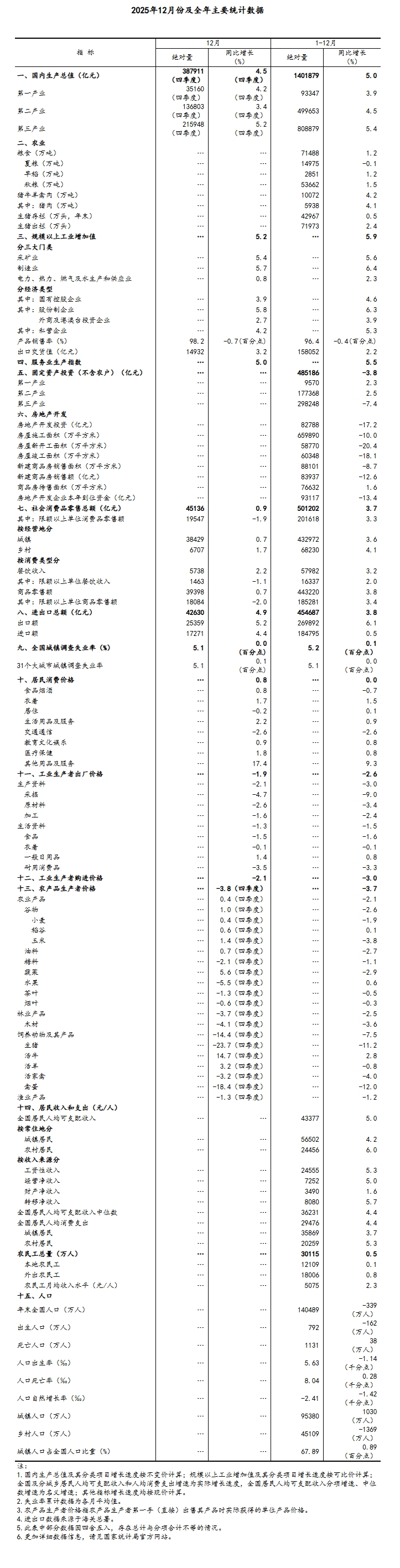 1月19日,国家统计局发布2025年中国经济年报。初步核算,全年国内生产总值1401879亿元,按不变价格计算,比上年增长5.0%。分季度看,一季度国内生产总值同比增长5.4%,二季度增长5.2%,三季度增长4.8%,四季度增长4.5%。从环比看,四季度国内生产总值增长1.2%。
