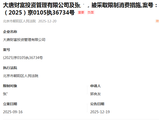 大唐财富与新湖财富的处境更为不堪。北京朝阳区法院先后对两家公司发出限制消费令,大唐财富因未履行给付义务,法定代表人张 XX 被禁止高消费及非必要消费,涉案案号(2025)京 0105 执 36734 号;