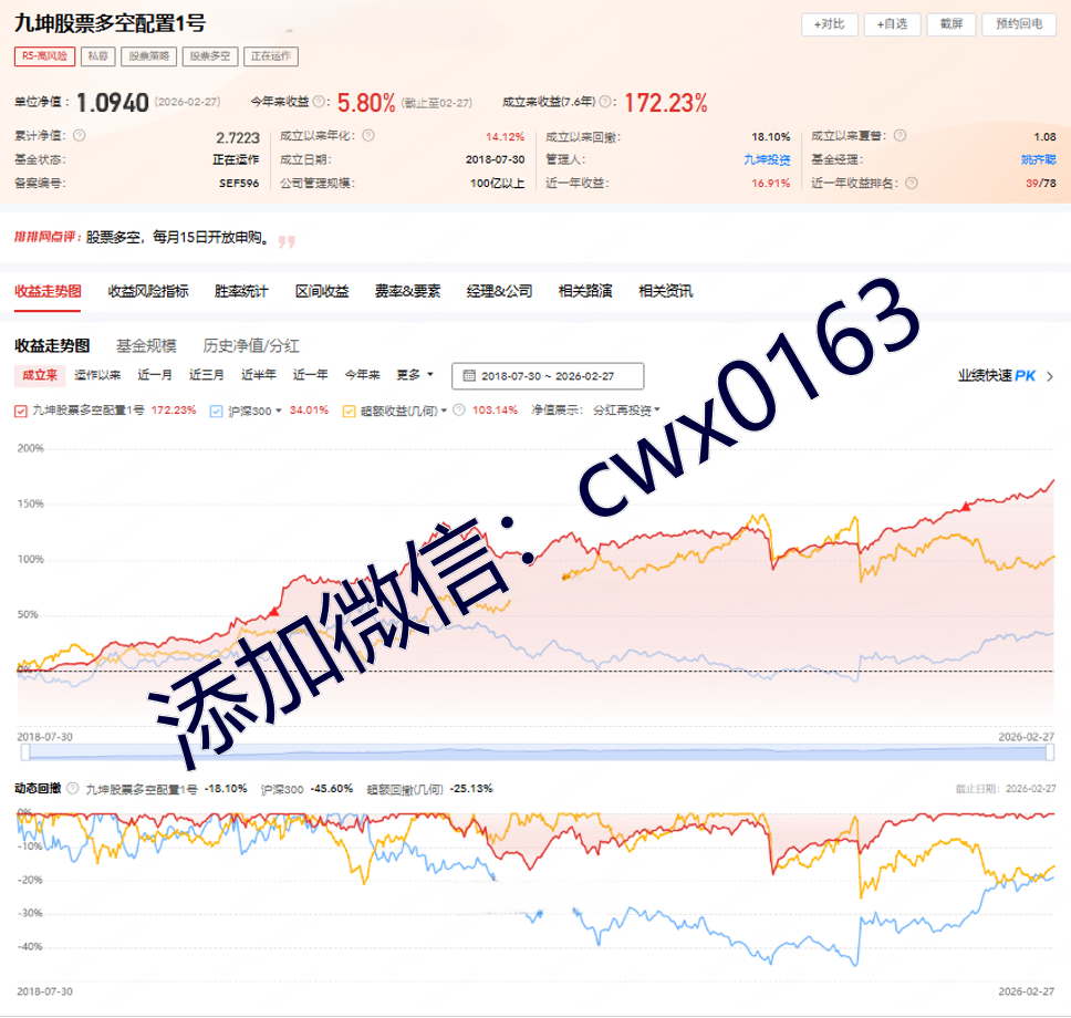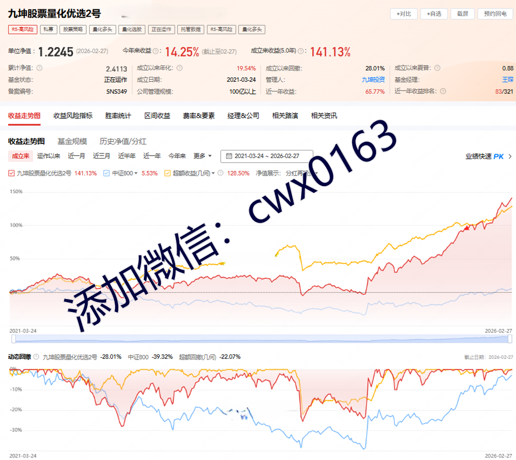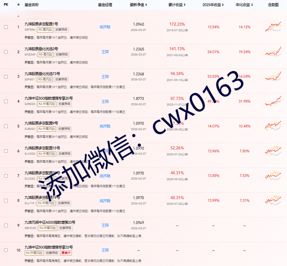 经过十数年的发展沉淀,九坤投资已成长为一家立足中国面向全球的量化对冲基金。依托于国际化的数学、物理、计算机等专业领域顶尖人才,将人类最前沿的研究和技术与金融投资紧密结合,致力于为投资人创造长期稳健的投资价值。免费帮助投资人进行私募产品分析,100万起投优质产品推荐,欢迎添加微信cwx0163