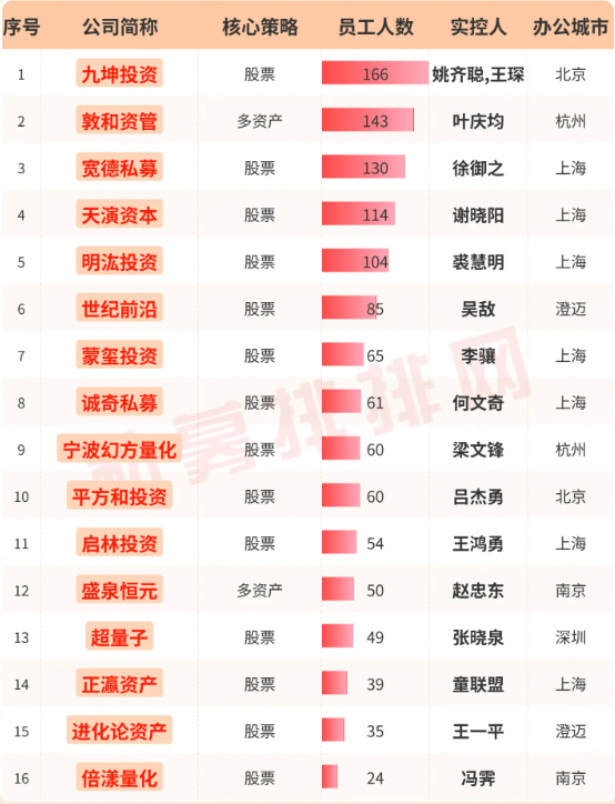 经统计,在私募网站有业绩展示的全部产品(产品数在3只及以上)均创新高私募中,至少有3只私募产品在私募网站有近1年业绩展示的百亿私募共有16家,其中,股票策略私募占14家,多资产策略私募占2家。员工人数超100人的有5家。