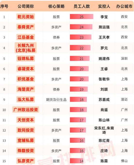 员工人数在20人以上的私募有:乾元资始、泰舜资产、江岳基金、长鲸九州(北京)私募、钰锦私募、睿凝资本、积优基金。