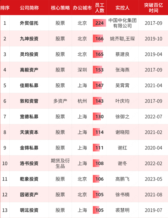 从员工人数来看,共有15家私募超过100人,数量和今年1月底持平。其中,人数超过150人的有外贸信托、高毅资产等4家。