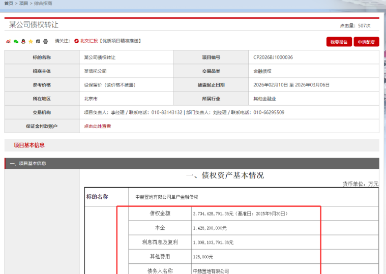 从项目披露信息来看,该笔债权以2025年9月30日为基准日,本金14.262亿元,叠加利息、罚息及复利13.08亿元,另有其他费用12.5万元,合计债权金额超27.34亿元。
