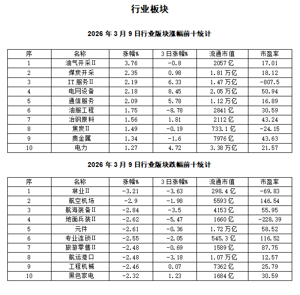 整体来看,涨幅榜集中在油气开采、煤炭开采等传统能源板块,叠加电网设备、电力等公用事业及 IT 服务、通信服务等科技服务方向,呈现能源避险与高景气科技服务共振的格局;跌幅榜则覆盖林业、航空机场、航海装备、地面兵装等国防军工与交运板块,以及元件、专业连锁、旅游零售等消费电子与消费服务领域。资金向能源、公用事业等防御性周期板块与高景气科技服务板块集中,市场结构呈现明显的避险与景气双主线特征,多数成长与消费板块陷入调整。