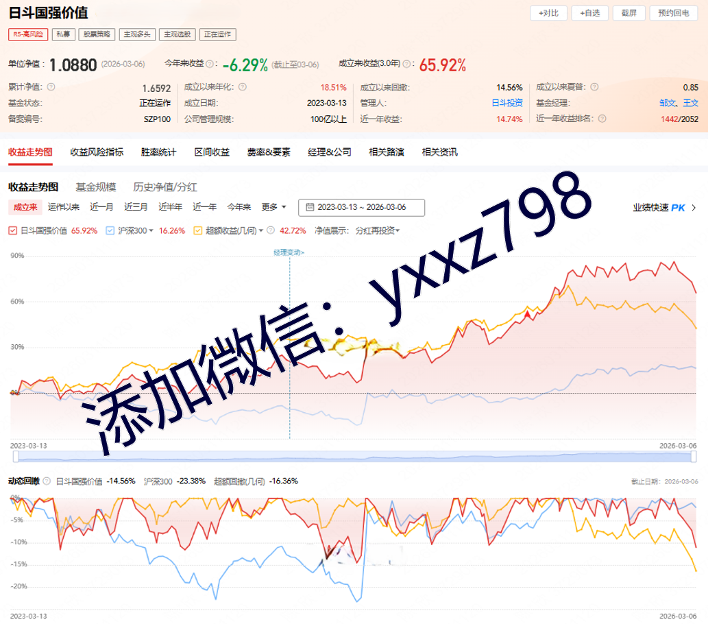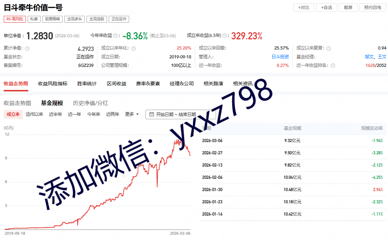 该产品为股票策略型R5高风险的私募基金产品,其单位净值为1.2830,今年以来的收益为-8.36%,成立6.5年以来的收益为329.23%,成立以来年化为25.28%,成立以来的回撤为25.57%,通过图片,可以观察到这支基金产品的基金规模,截止到2026/3/6的基金规模为9.32亿元。头部私募基金,长期跟踪帮助投资人分析市场,根据市场走势配置私募产品,欢迎添加我微信yxxz798