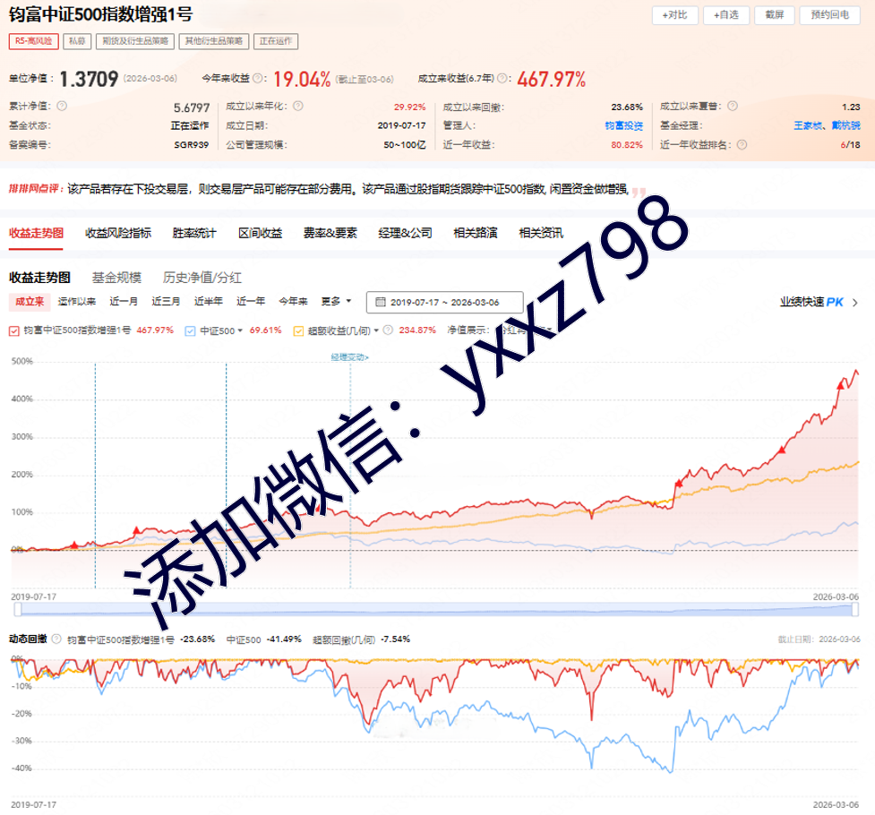 该产品为期货及衍生品策略型R5高风险的私募基金产品,其单位净值为1.3709(截止至2026-3-06),今年以来的收益为19.04%(截止至2026-3-06),成立6.7年以来的收益为467.97%,成立以来年化为29.92%,成立以来的回撤为23.68%,通过图片可以观察到该只私募基金产品成立以来的收益走势图。头部私募基金,长期跟踪帮助投资人分析市场,根据市场走势配置私募产品,欢迎添加我微信yxxz798