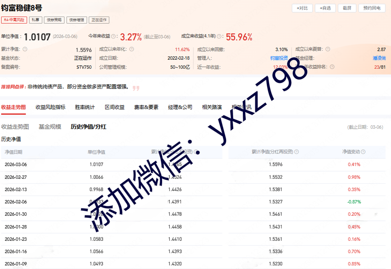 该产品为债券策略型R4中高风险的私募基金产品,其单位净值为1.0107(截止至2026-3-06),今年以来的收益为3.27%(截止至2026-3-06),成立4.1年以来的收益为55.96%,成立以来年化为11.62%,成立以来的回撤为3.10%,通过图片可以观察到该只私募基金产品成立以来的历史净值/分红。头部私募基金,长期跟踪帮助投资人分析市场,根据市场走势配置私募产品,欢迎添加我微信yxxz798 六、2026年投研迭代