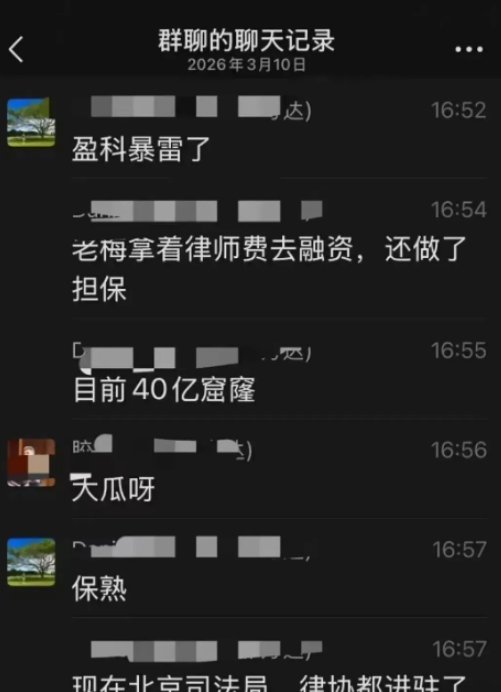 网传截图显示“盈科暴雷了”“老梅拿着律师费去融资,还做了担保”“目前40亿窟窿”等信息。此群聊信息,意味着盈科老板梅向荣(人称老梅)拿着律师费去融资并担保暴雷,目前涉及40亿窟窿。现在,北京司法局、律协都进驻(北京盈科律所)了。有资产配置需求,可加微信yxxz798,获取专属建议