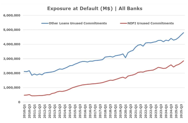 德银并非孤例。联邦存款保险公司(FDIC)数据显示,美国银行业对非存款类金融机构(NDFI)的贷款增长迅速,2025年底达到1.4万亿美元。更令人担忧的是,银行对这些机构还有高达2.8万亿美元的未提取贷款承诺。这意味着,一旦私募信贷机构面临流动性枯竭并大规模提取这些信贷额度,银行将面临巨大的违约风险,潜在敞口总额高达4.2万亿美元。