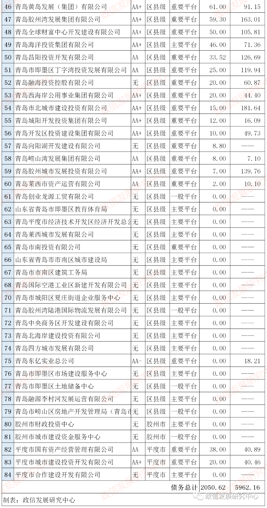 城投概况:青岛市共有84个城投平台,其中AAA级平台5家,AA+级平台20家,AA级平台12家,AA-级平台1家。平台累计债券余额2050.62亿,公开有息债务5962.16亿。