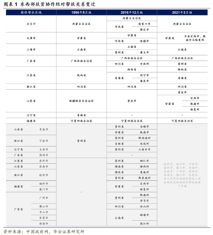 2021年结对关系再度调整,城市帮扶在省际间结对帮扶框架下统筹安排,不再单独安排帮扶对象,同时部分省份以省内结对帮扶为主,不再安排省际间结对帮扶。2021年3月,中共中央办公厅、国务院办公厅印发《关于坚持和完善东西部协作机制的意见》,其中在结对安排方面,辽宁省不再承担结对帮扶任务,苏州、杭州与宁波等东部城市帮扶工作在新的省际间结对帮扶框架下开展;同时河北省、吉林省、湖北省与湖南省帮扶地区经济社会快速发展,且省会城市已具备帮扶能力,因此后续将以省内结对帮扶为主,不再实施省际间结对帮扶;省际间帮扶结对关系大致不变,其中广东与江苏两省由于经济实力较强,因此负责两个省份的结对帮扶,此外山东省同时负责重庆市与甘肃少部分地州市的结对帮扶协作工作。