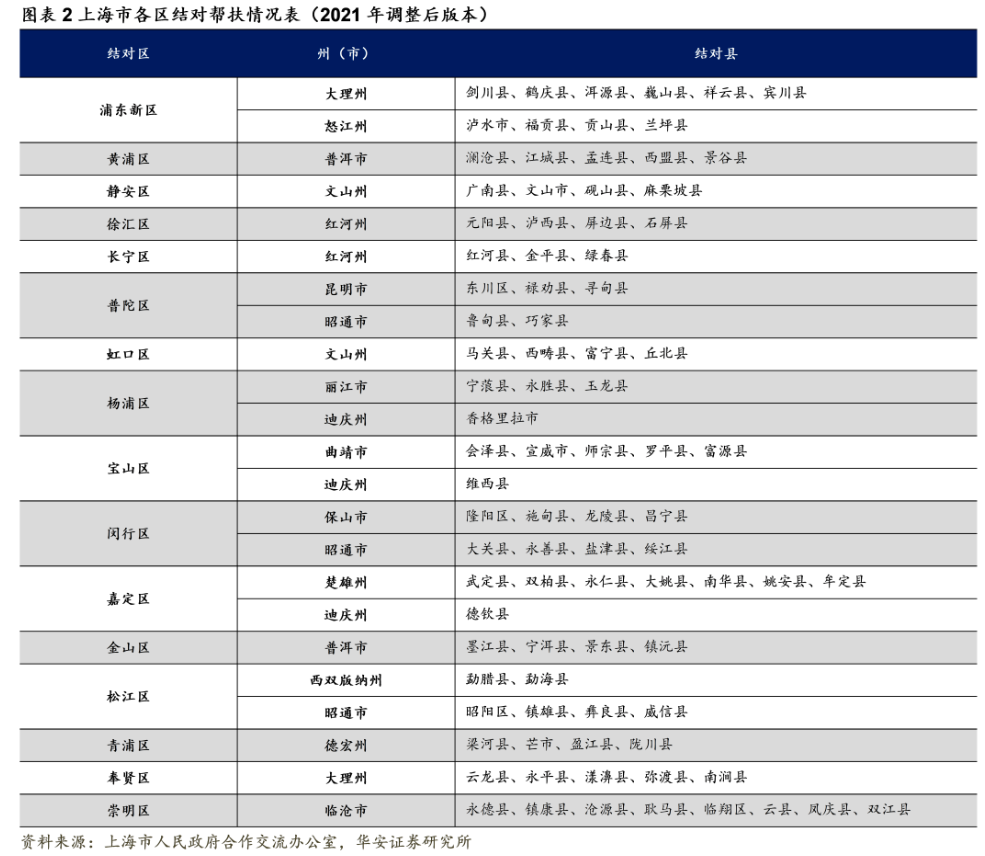 政策运行20余年,尽管历经诸多调整,但推动区域协同发展,打赢脱贫攻坚战,最终实现共同富裕的大方面未曾调整,东部地区通过产业合作、劳务协作、人才支援、资金支持以及社会参与等方面的支持,帮助被帮扶西部地区经济快速发展。本篇报告我们将以上海为例,简单梳理上海市对云南省的资金支持。