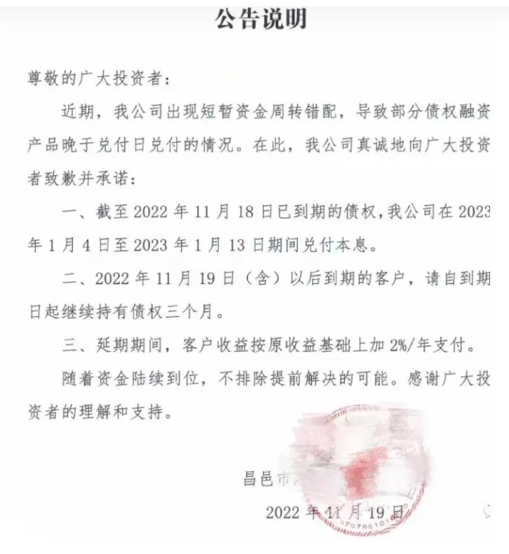 定融产品发生延期后,融资方也就是城投公司,也出现恐惧心理,过去没遇到这种情况,如今遇到投资人要上门拉横幅,销售方上门要钱。销售让城投公司出延期公告,城投公司也不敢出,出了延期公告影响其他融资,不出延期公告,销售无法跟投资人交代,前后矛盾!就这么一直压着,一直捂着。