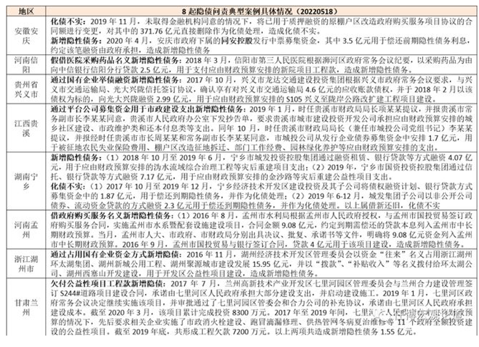 一、终身问责与倒查责任:财政部年内连续两次通报16起隐性债务问责案例(一)2022年5月:年内首次通报8起隐性债务问责案例