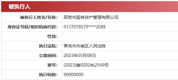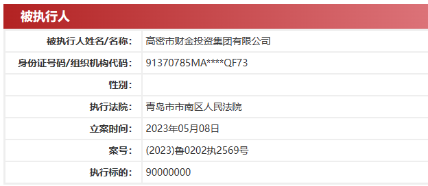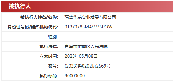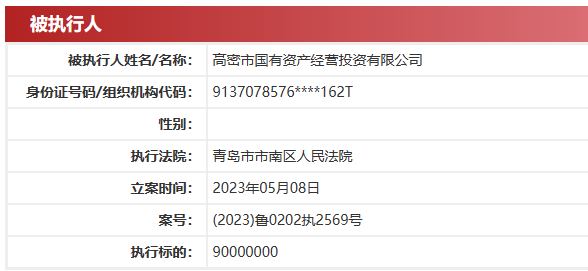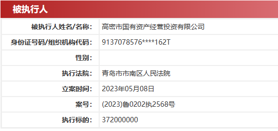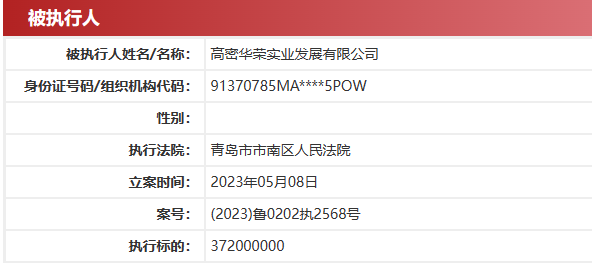 中国执行信息公开网披露,高密华荣实业发展有限公司、高密市财金投资集团有限公司、高密市国有资产经营投资有限公司以及高密市国有资产管理有限公司于2023年5月8日被纳入被执行人名单,被执行案号分别为(2023)鲁0202执2568号、(2023)鲁0202执2569号,被执行标的金额分别为372000000元、90000000元。