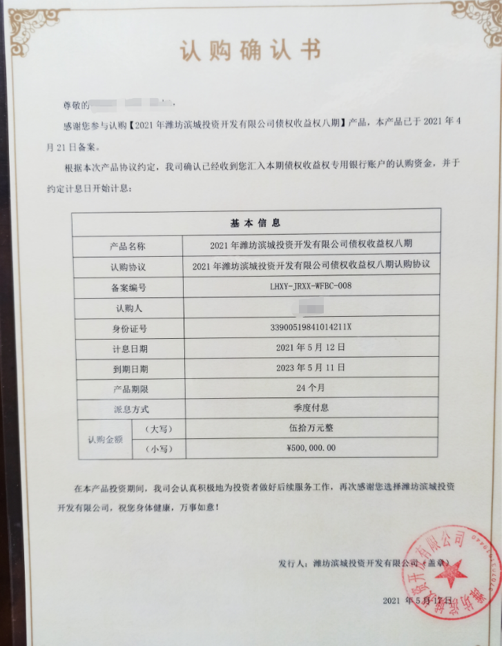投资人反馈自己认购50万,2021年潍坊滨城投资开发有限公司债券收益权八期产品,到期后潍坊滨城开发有限公司不给兑付,违约一月有余