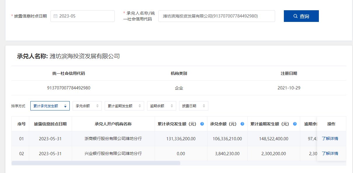 根据上海票据交易所信息查询,潍坊滨城投资开发有限公司商票持续违约