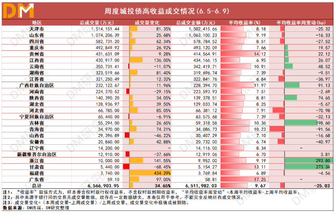 其次,6月12日,上交所披露,天津城建的“19津投04”跌超22%盘中临停,临停前成交净价报77.3元,该债券上次成交在3月19日,于103.95元成交。据DM研究数据,就在刚过去的一周天津收益率出现小幅下行,但成交量有所上升,天津周成交量超过150亿,排在了高收益城投债周交易的榜一。
