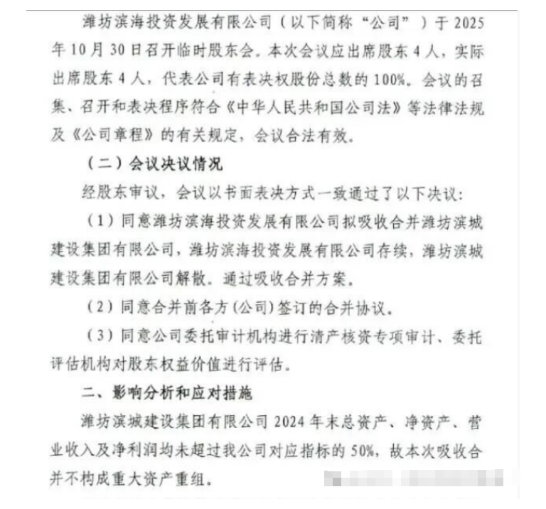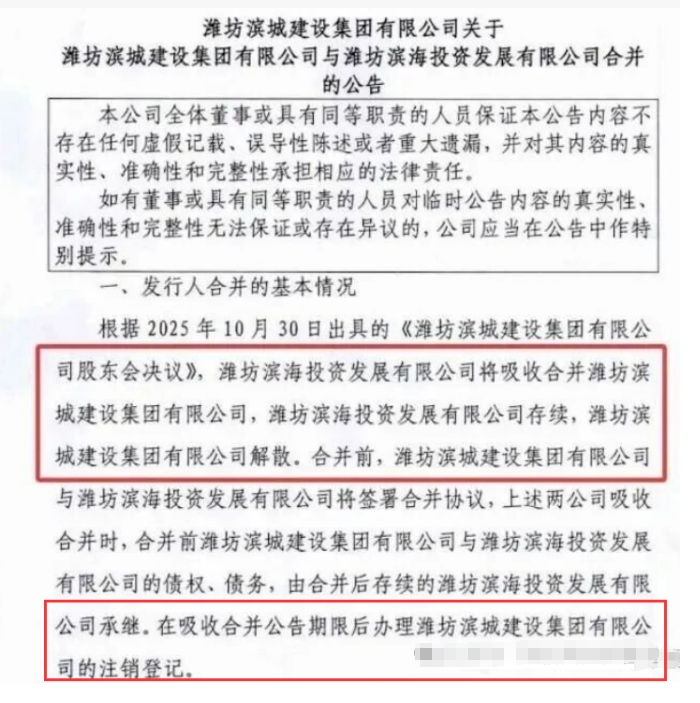 2025年11月3日,潍坊滨城建设集团有限公司公告,明确潍坊滨海投资发展有限公司将吸收合并潍坊滨城建设集团有限公司,后者解散并注销登记。合并后,潍坊滨海投资发展有限公司将承继两公司原有债权债务,不影响偿付能力。 公告显示合并前,滨城集团与滨海投资将签署合并协议,上述两公司吸收合并时,合并前滨城集团与滨海投资的债权、债务,由合并后存续的滨海投资承继。在吸收合并公告期限后办理滨城集团的注销登记。 此次合并是潍坊市深化国企改革的重要举措,旨在优化国有资本布局,提升企业运营效率。关于市场关注的存续债券问题,企业明确表示"21滨建01"及"22滨建01"两期债券的偿付能力不会受到合并影响。公司计划于2025年11月25日召开专项会议,与债券持有人充分沟通后续处置方案。其他债务问题相信也会在合并后一并合并核算。