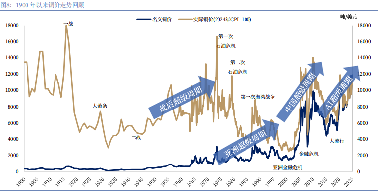 大家常说铜是 “铜博士”,能精准感知经济冷暖。但很少有人留意,这枚金属背后藏着百年全球经济的 “时代密码”。回溯历史,铜价的每一轮超级上涨周期,都不是孤立的价格波动,而是和当时的全球产业升级、地缘博弈、货币松紧深度绑定的时代缩影。