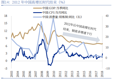 2012 年后,中国经济增速放缓,GDP 和 CPI 持续下降,“中国总量增长” 的驱动效应越来越弱。2012 到 2016 年,铜价经历了 5 年熊市,从 10495 美元 / 吨跌到 7350 美元 / 吨,跌幅 30%。2018 年,铜价基本回落至 2015 年末水平,这轮由中国驱动的超级周期正式落幕。
