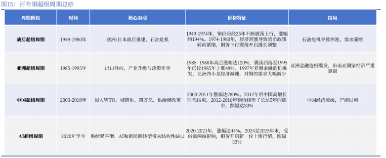 第一轮落幕是因为石油危机后的货币紧缩,第三轮有美联储 QE 的助推,当下则是全球 “去美元化”、地缘风险加剧,让铜的战略储备需求上升。货币宽松、地缘紧张会放大铜价涨幅,而货币紧缩、需求萎缩则会终结周期。