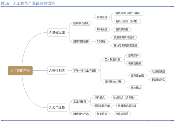 再看中游的半导体环节,AI 芯片的制造设备、服务器的核心硬件,里面的散热部件、电路主板,也都离不开铜。现在 AI 芯片的功率越来越高,比以前的芯片高 2 到 10 倍,这就需要更多的铜来保障供电和散热。
