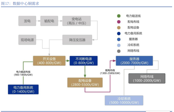 先看上游的算力基础设施,也就是我们常说的数据中心。AI 要处理海量数据,得靠成千上万台服务器同时工作,这些服务器本身就需要大量铜来做电路、主板;而且服务器工作时会产生巨量的热量,要是不及时散热就会死机,所以数据中心里的液冷系统、热交换器,都得用铜这种导热好的材料;除此之外,给整个数据中心供电的电源系统、变压器、高压电缆,全是铜制品。