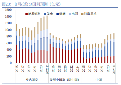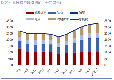 首先是电网投资进入了加速期。现在 AI、新能源汽车这些东西越来越多,对电力的需求越来越大,以前的电网已经跟不上了,成了制约发展的瓶颈。所以不管是中国还是发达国家,都在大力搞电网建设和升级。2022 年全球电网投资就增长了 12.9%,之后增速还在不断提高,预计到 2025 年,全球电网累计投资会达到 3.3 万亿美元。