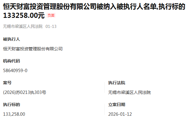 司法文书的严肃性,在中植系的残局面前显得苍白无力。近期,恒天财富投资管理股份有限公司被无锡市梁溪区人民法院列为被执行人,执行标的仅 13.33 万元 —— 这个看似不起眼的数字,绝非偶然,而是其债务清偿能力枯竭的直接写照。事实上,恒天财富旗下关联主体早已被多条执行记录、限制消费令缠身,所谓 “兑付承诺” 早已沦为空谈。