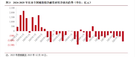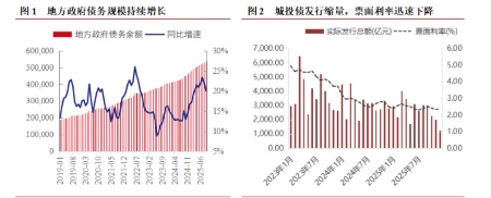 2023年9月,35号文一揽子化债政策启动了我国新一轮化债周期,此后两年间,通过大规模特殊专项再融资置换,地方政府显性债务规模快速增长,2025年9月末全国地方政府债务余额达到53.70万亿元,较2023年9月末增长余额15万亿;另一方面,“控新增”的监管导向下,城投债净融资规模持续缩量,发行节奏明显放缓,票面利率大幅下降。按各月新发行债券的平均票面利率来看,该指标已从2023年1月的4.96%下降至2025年11月的2.34%。2024年是开启“一揽子化债”周期后的第一年,也是城投债“缩量元年”,全年城投债净融资额出现了历史上首次年度级别的负增长;2025年以来,城投债净融资流出趋势延续,且流出规模在下半年显著扩大。