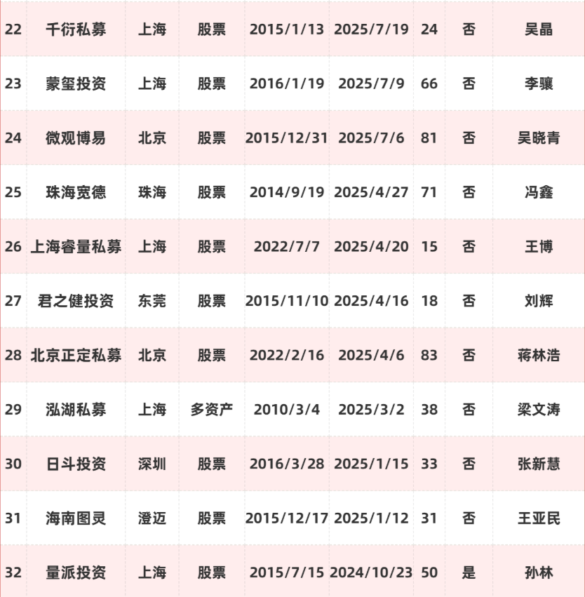 具体来看,有8家私募为首次突破百亿,分别是:国源信达、恒毅持盈(深圳)私募、倍漾量化、腾胜投资、姚泾河私募、泰康稳行(武汉)私募、四川发展证券投资、宏锡基金。重回百亿私募的有5家,分别是:洛书投资、遂玖私募、展弘投资、汐泰投资、申毅投资。此外有3家私募掉出百亿阵营。